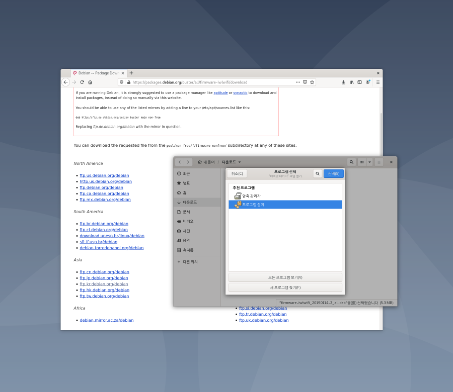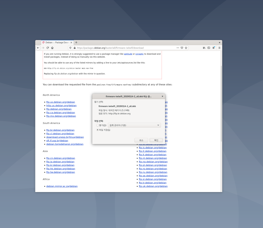 packages.debian.org/buster/all/firmware-iwlwifi/download 로 이동하여 파일을 받고, 패키지를 설치합니다.