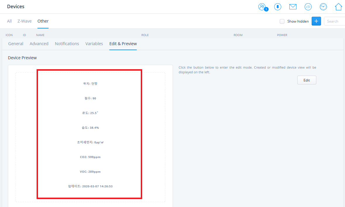 메인화면으로 가면 sensor에 적은 값으로 표시가 된다.