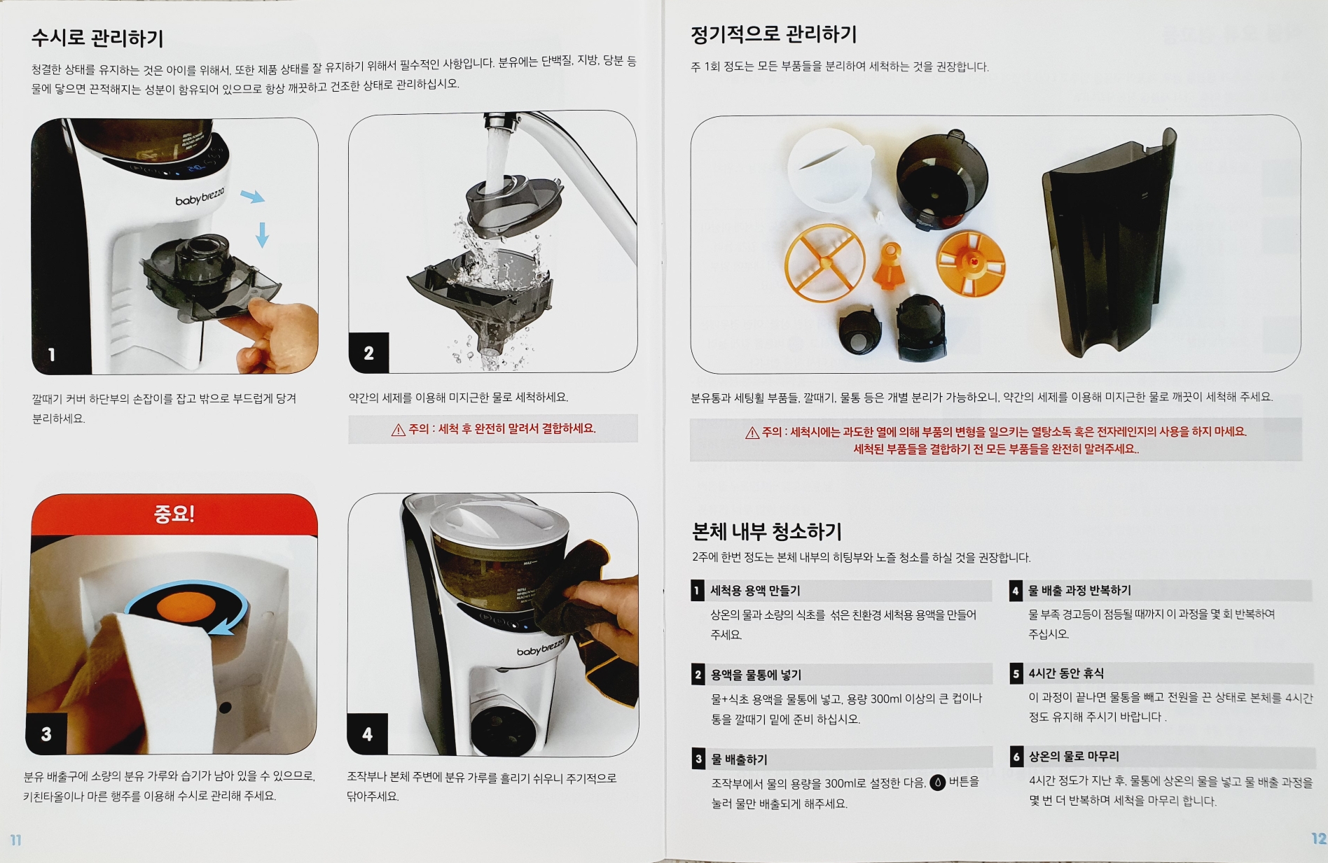 하루에 두 번가량 때가 되면 분유 깔때기를 씻어주고