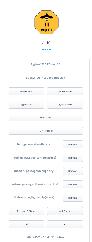 7. Zigbee장치 리스트 = < > 화살표를 눌러서 페이지 이동 가능, 버튼 누르면 개별 삭제/설치